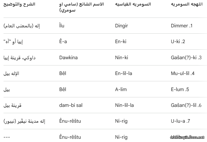 من المؤسف أنه لم يتم العثور على قوائم للآلهة في حالة كاملة بما يكفي للسماح بتحديد المخطط الذي وضعت بموجبه دون شك. ومع ذلك، يمكن اعتبار أنه من المرجح أن هذه القوائم، على الأقل في بعض الحالات، مرتبة بالتوافق (إلى حد معين) مع ظهور الآلهة في ما يسمى بقصة الخلق. يبدأ بعضها بـ "آنو"، ويعطيه أسماء مختلفة، من بينها أنشار وكيشار، ولاهمو ولحامه، إلخ. ومع ذلك، فإن الأكثر إثارة للاهتمام بشكل خاص هو قائمة الآلهة ثلاثية اللغة الشهيرة، والتي تحتوي على أسماء مختلف الآلهة بالترتيب التالي:
