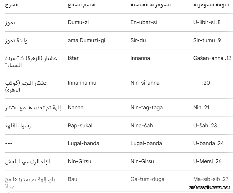 السطر 36: U-mu-zi-da (Nin-giš-zi-da) - نين-جيش-زيدا: "سيد الشجرة الأبدية".